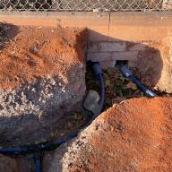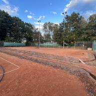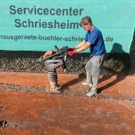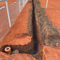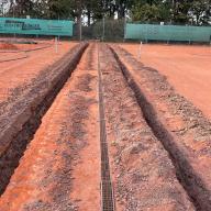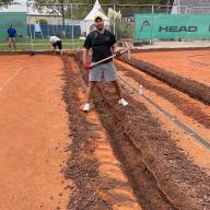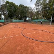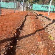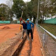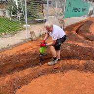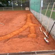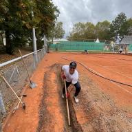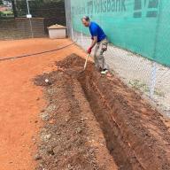 Die Modernisierung der Beregnungsanlage auf den Plätzen 1 und 2 geht in die Endphase. Inzwischen sind alle Leitungen verlegt, die neuen Regner angeschlossen, getestet und auch die Leitungsgräben wieder verschlossen. Zum Abschluss werden die Plätze wieder gesäubert und die Deckschicht mit neuem Ziegelmehl wieder hergestellt.